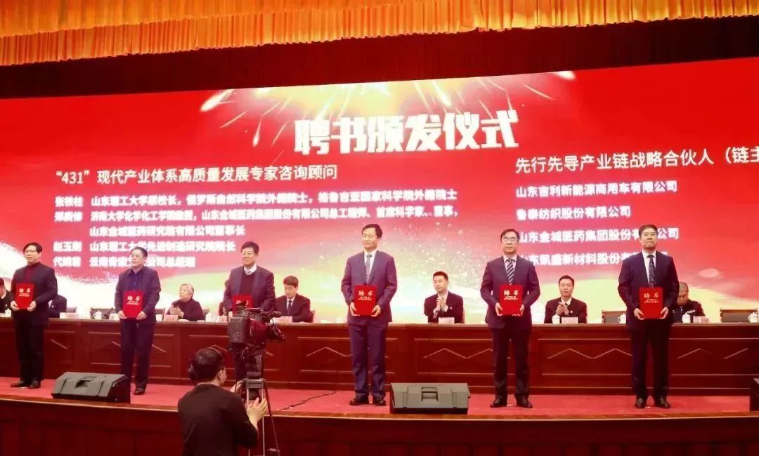 淄博市副市长、淄川区委书记田兵兵为凯盛新材王加荣董事长等淄川区先行先导产业链战略合伙人及“431”现代产业体系高质量发展专家咨询顾问代表颁发聘书。